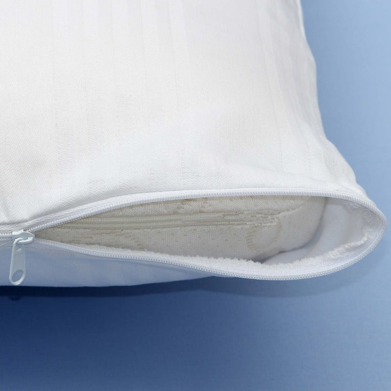 Le sottofedere Mitra sono in tessuto damasco di puro cotone con cerniera e traspiranti. Trattamneto Sanfor è un finissaggio praticato, quasi esclusivamente, sui tessuti di cotone di pregio per fissarli nelle sue dimensioni ed evitarne il restringimento durante l'uso e nei frequenti lavaggi.