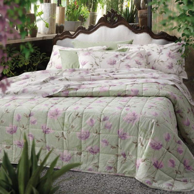 Copriletto Trapuntato Eternity - Da sempre Profumo di Lavanda è la collezione dall anima romantica e sognante di Gabel 1957. Il copriletto trapuntato Eternity, dall'interpretazione floreale tra il classico e il moderno, è stampato su tessuto Sweet Touch, in saia jacquard da 58 fili al cmq. Tessuto sotto: madapolam di puro cotone da 58 fili al cmq con imbottitura in morbida fibra rigenerata anallergica di poliestere.
