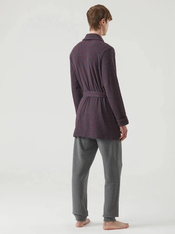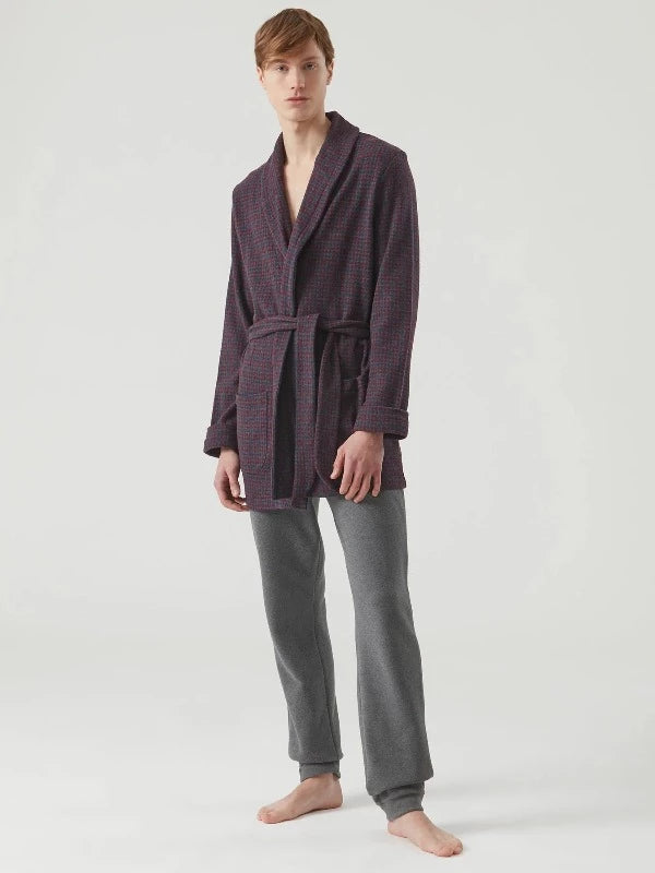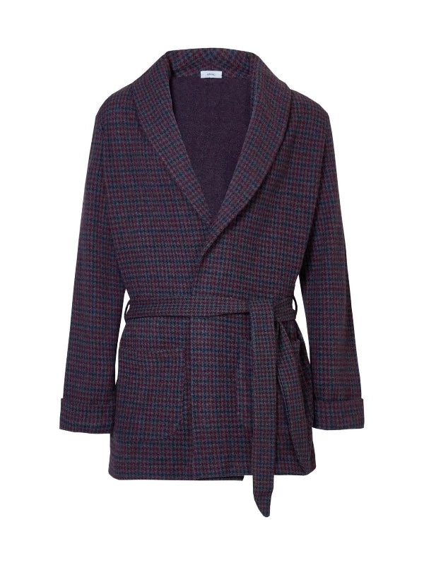 La vestaglia corta è un classico per chi ama il disegno pied de poule nelle tonalità del bordeaux, con scialle , tasche e cintura in vita