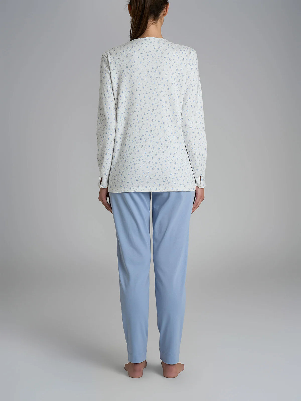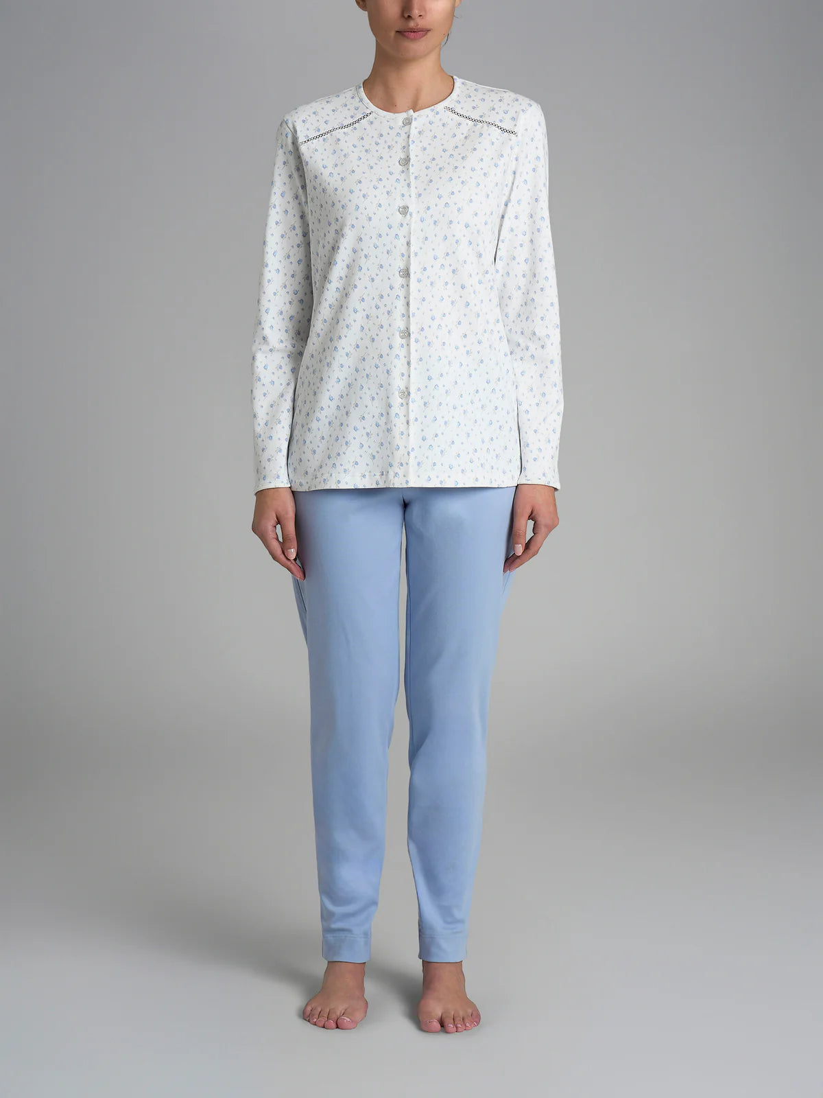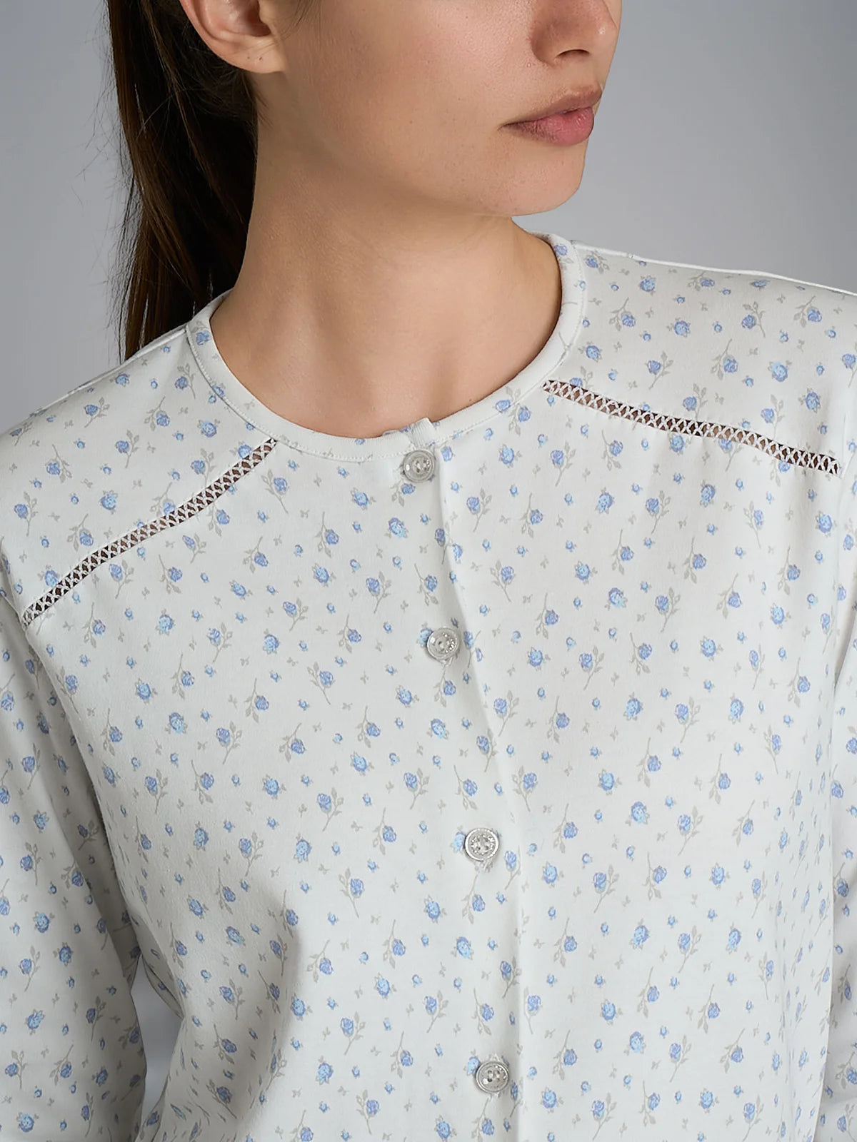 Questo pigiama lungo da donna a manica lunga si caratterizza per la sua casacca aperta con una raffinata cucitura con punto croquette che seguendo la forma delle spalle scende delicatamente definendone la forma. I bottoni consentono una facile apertura e chiusura, facilitando l'indosso e la rimozione donando una libertà di movimento.
