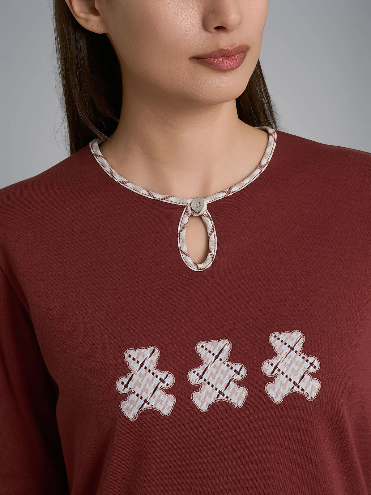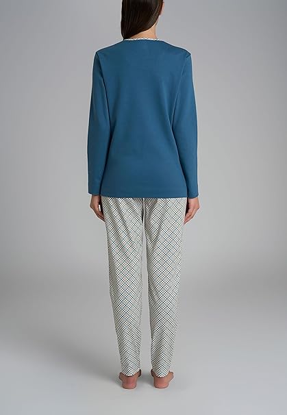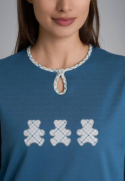 Questo pigiama lungo da donna a manica lunga si distingue per la casacca con girocollo a goccia definito da un elegante bottoncino che crea un elegante ovale sul decolté.