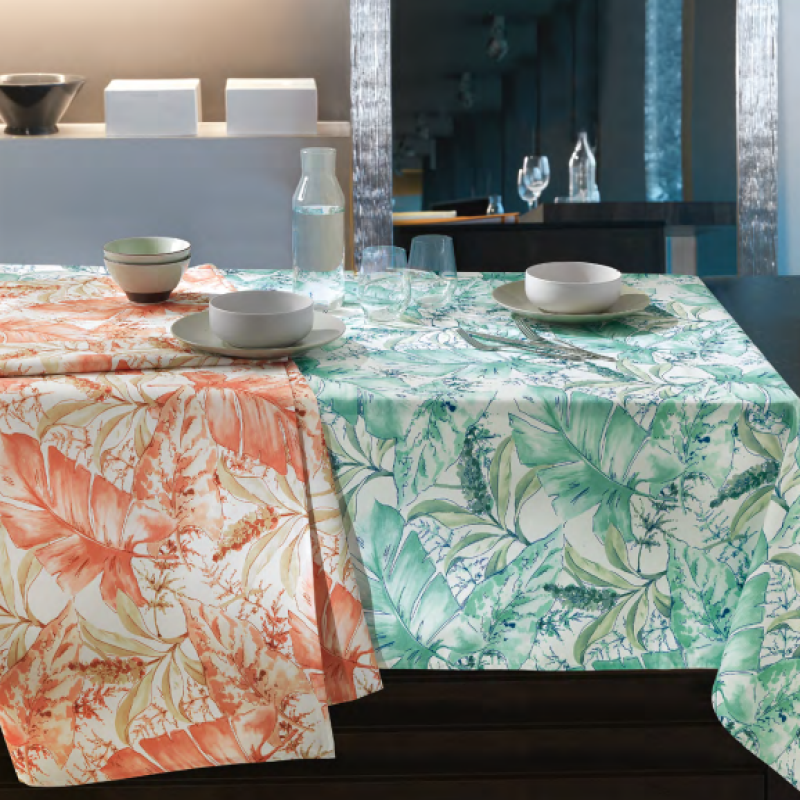 Vuoi dare un tocco di freschezza alla tua cucina? Scegli Samos, la nuova tovaglia della collezione Bianco di tutti i colori tavola firmata Gabel 1957. Un macrofoliage nei colori mojito e corallo stampato su panama di puro cotone.